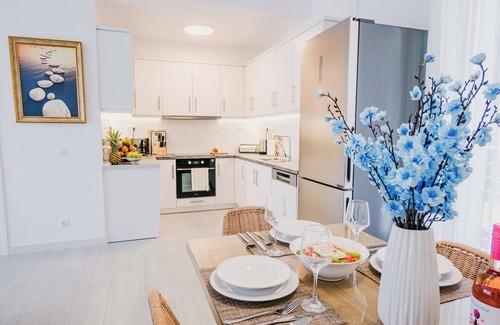 Lounge Area: Step inside to a beautifully designed open-plan living, dining, and kitchen area. A large 55-inch TV with a full entertainment package, high-speed Wi-Fi, and a plush corner sofa invite you to relax in style. Floor-to-ceiling French doors connect the interior with the terrace, letting in natural light and offering seamless indoor-outdoor living.