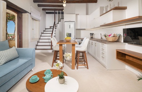 Dafni Villa boasts a spacious 180m² indoor area, carefully crafted to combine the timeless charm of Crete with contemporary elegance. Exposed stone walls, wooden beams, and elegant design elements foster a cozy and welcoming ambiance, while premium furnishings and modern amenities guarantee an experience of unmatched comfort. The villa comprises three interconnected yet independent residences, offering privacy and convenience for up to 9 adults and 3 children. Each residence includes a double bedroom on its first floor with a double sofa bed (suitable for 2 more guests), a boudoir, and access to a private balcony with breathtaking countryside views. The living rooms on the ground floor, equipped with flat-screen TVs with satellite reception and cozy sofas, provide a relaxing retreat, featuring open-plan designs with fully equipped kitchens. One of the living room also features a charming stone fireplace. Additionally, a well-appointed ground-floor room is thoughtfully equipped with a washing machine, iron, and ironing board, ensuring effortless convenience for all your needs during your stay. With its carefully designed layout and exquisite details, Dafni Villa offers an unforgettable stay, seamlessly blending traditional charm with contemporary elegance.