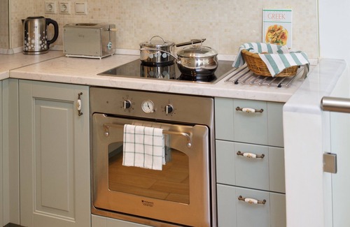 KALLISTI duplex apartment (115m2) consists of the first floor and the ground floor. The first floor has one double bedroom with fitted wardrobe, one bathroom with hydro-massage shower, an open plan living room, fireplace, leading to a balcony with beautiful view to the sea, mountain and to a private garden. An elegant dining area with table seating 6 people, a fully equipped kitchen(dishwasher, oven, fridge/freezer, microwave, toaster, coffee maker, kettle) and all the cooking utensils.