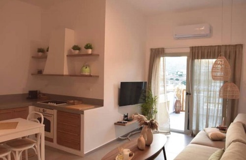 It is located in the center of Chorio. At a very close distance from a supermarket (20 meters) , the traditional bakery (50 meters) and the village square with the church of St. John the Theologian. It is also 5 minutes away from the park (playground) and the ouzo and restaurants of the island in the port.