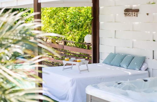 Furthermore, on the other side of the pool, there’s even a private, two-seater, heated spa whirlpool tub for those who prefer to stay cool and under the shade at the same time! Spoil yourselves by using the 16 hydromassage jets, the 16 aeromassage led jets or enjoy a chromotherapy session while listening to the radio or your favourite music from your mp3 or mobile phone!