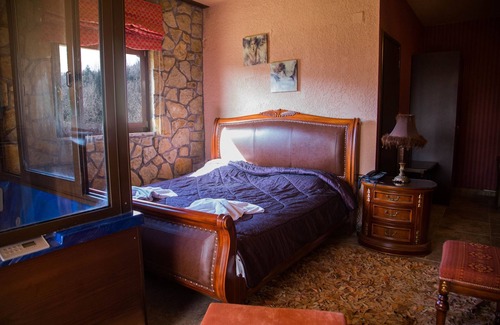 One space suite apartment including private indoor heated mini-spa pool with steam shower cabin, 1 queen size Canadian bed, stone curved fireplace and magnificent view of Lake Plastira and the forests