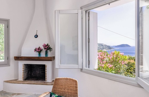 with sweeping views of the sea, the island of Skiathos, and the hilltop village of Glossa.