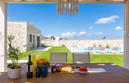 Thalmargia Villa I is perfect for al fresco dining on a summer's eve. BBQ facilities are available outdoors, as well as a dining area under a shaded pergola! There's even a traditional oven to put a Mediterranean spin on romantic lunches and BBQs. Set in 470m2 outdoor area with a private 36m2 swimming pool and a 300m2 lawn covered area, this Villa will invite you to enjoy the pleasures of summer, under the clear blue sky!