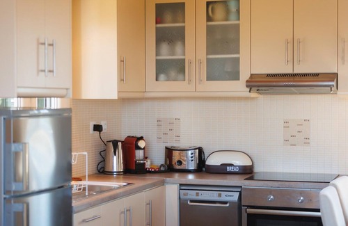 The kitchen is air-conditioned and features a toaster, coffee maker,