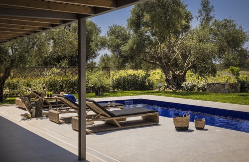 Villa Joyana, the largest villa in the estate with a mix and match style and colours of forest green, blue & whiskey making it a lovely place for your holidays. 100 m2 in a ground floor layout suitable for 4 persons.