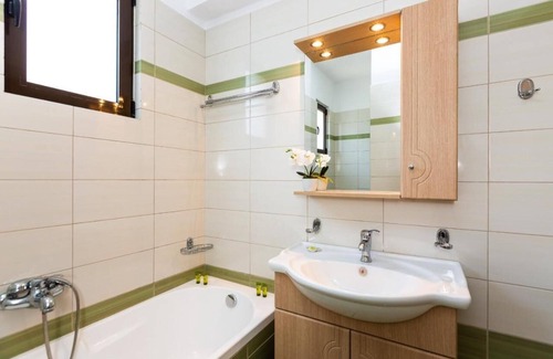 The villa features three bedrooms located on the first floor. There is a master bedroom with a double bed with balcony access and views to the swimming pool and the Aegean sea. Next to that there is one more bedroom with twin beds and the same characteristics. Just opposite of these rooms, there is one more bedroom with twin beds and an ensuite bathroom.