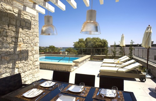 The Exclusive 4 bedroom villa privée has a private pool (heated) with mosaic tiles, swimming and hydro massage jets that makes it a unique experience for your summer holiday. Relax while drinking your cocktail in the pool overlooking the stunning sea views or enjoy the sunset while having an al fresco dining experience.