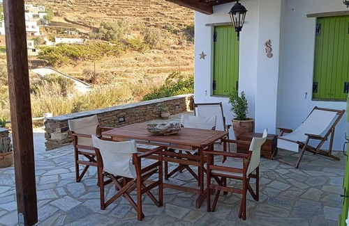 Traditional Cycladic villa built on 4 acres of land in an idyllic location surrounded by nature near Kionia beach on Tinos island. House has 2 bedrooms with double beds, 2 bathrooms, living room with sofa bed and fully equipped kitchen. Accommodates 4-5 guests. Upper level has 2 bedrooms with great sea views and verandas. Ground floor has living room, kitchen, bathroom and terrace. House adapted for mobility impaired guests. Short walk to village. Quiet, natural setting away from city noise.